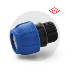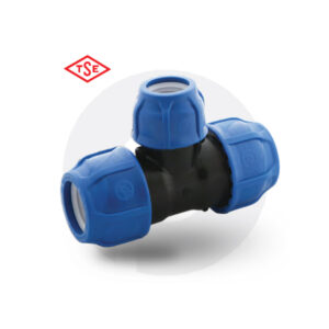 Proizvodi POELSAN Turska. Uvoznik za Srbiju METALIK-PLAST, Niš. Plava kompresiona lakat spojnica za spajanje dva polietilenska creva, za pritiske PN16.